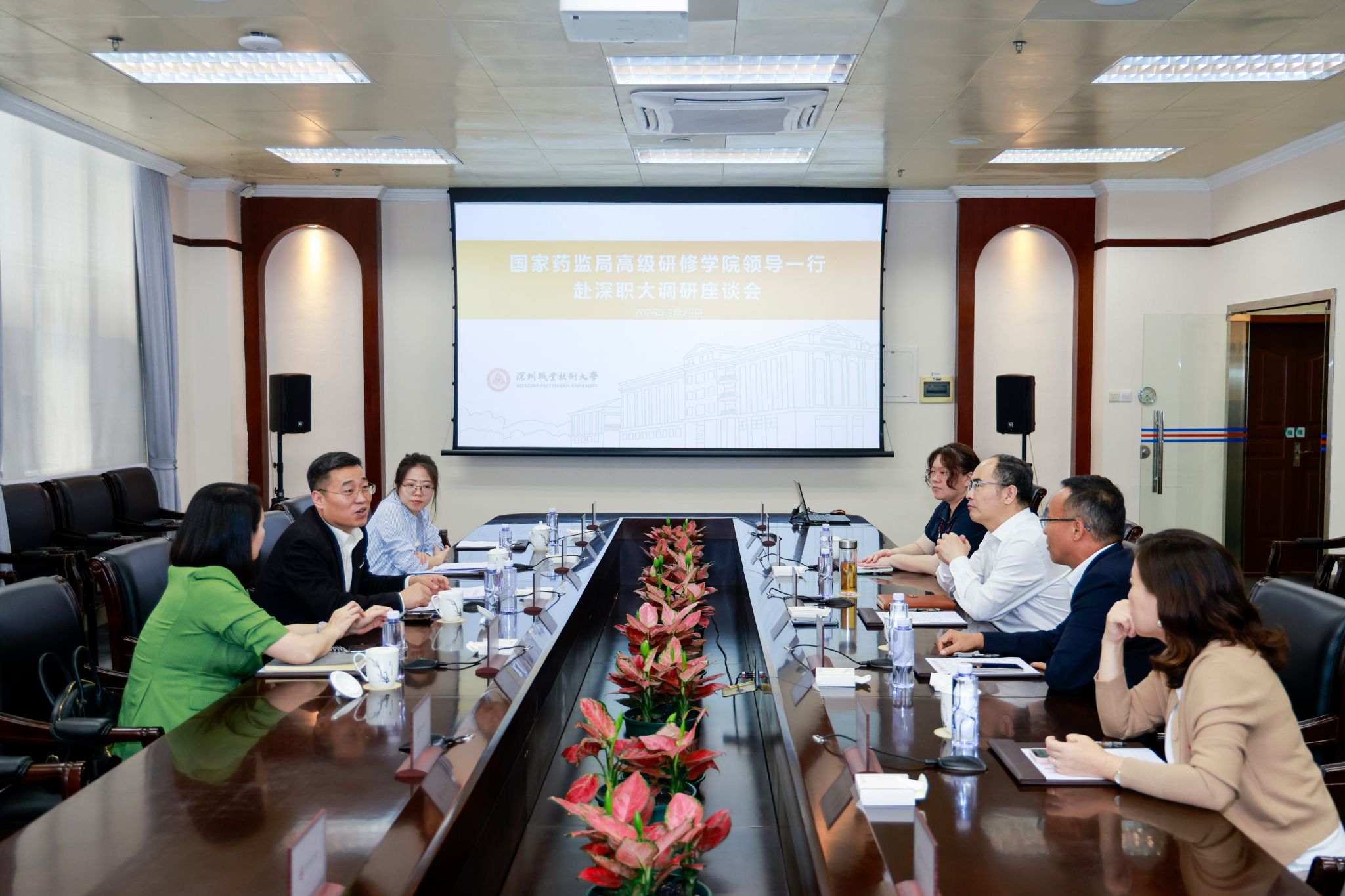 3月25日上午,国家药品监督管理局高级研修学院党委委员、副院长臧克承一行来校考察调研。深圳市市场监督管理局许可审查中心干部吴赟生、黄碧敏随同来访。suncitygroup太阳集团党委副书记、校长许建领,党委副书记何莉,suncitygroup太阳集团党委书记、院长刘冬、药学专业主任刘然、药学专业教授孙海燕等参与调研活动。