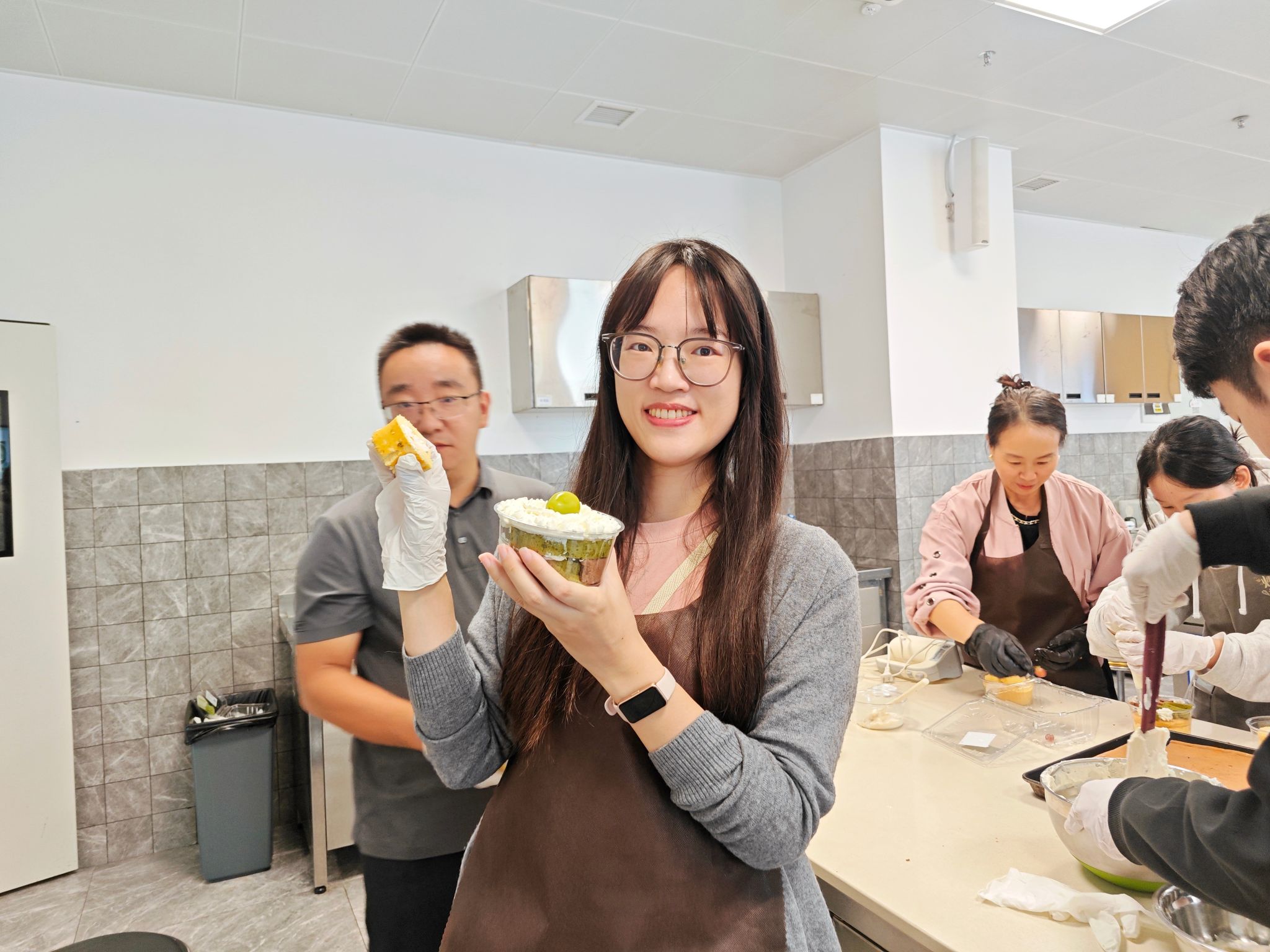 老师们热情高涨,认真聆听讲解后纷纷动手实践,称量原料、搅拌面糊、打发奶油、精心裱花、小心卷制,每一个步骤都专注投入。过程中,大家相互交流经验、分享心得,现场欢声笑语不断。活动尾声,老师们手捧着自己亲手制作的甜点,脸上洋溢着满满的成就感,部分老师还带着这份甜蜜成果前往后续的拔河比赛现场。
