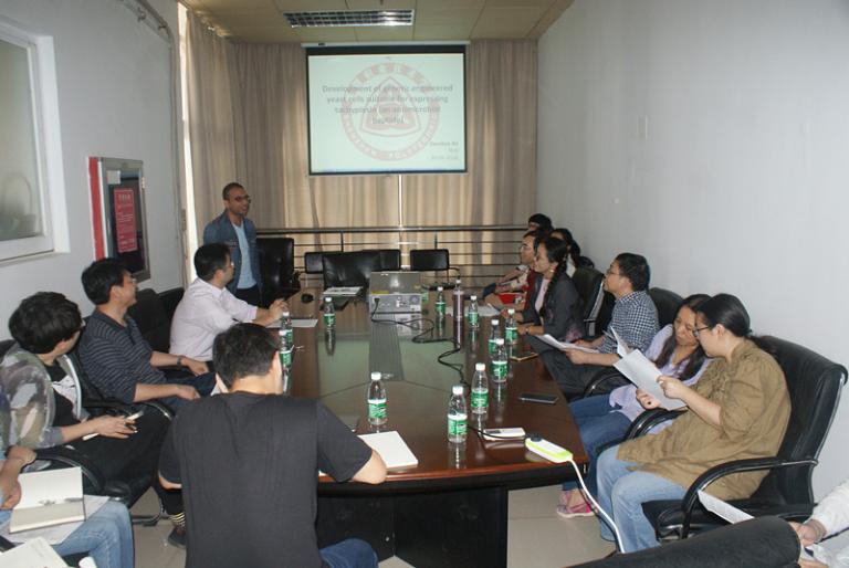 Ali博士以“Development of genetic engineered host suitable for expressing tachyplesin I”为题,全面介绍了博士后课题设计,提出了利用最新Crispr/Cas 9基因编辑技术提高表达量的研究方案。王妍教授等5位考核小组成员给予了较高的评价,并一致同意Ali博士通过开题考核。同时5位专家也提出一些建设性的建议和问题,为Ali博士提供了一些新的思路。(化生学院 唐勇军)
