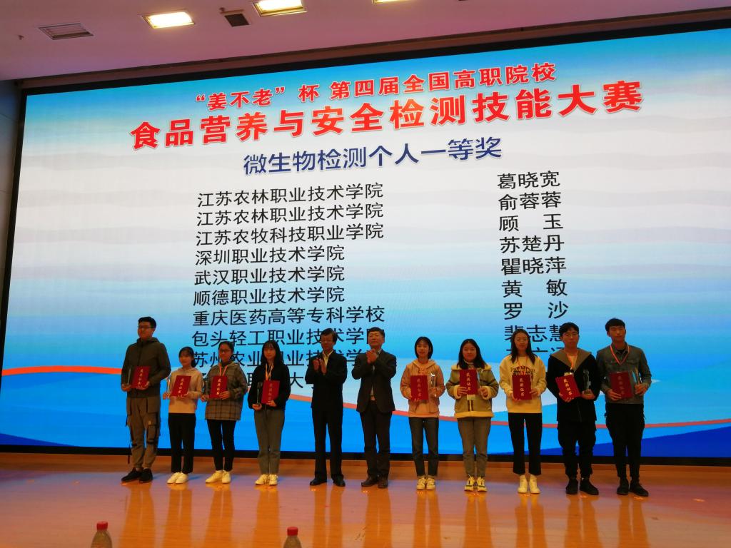 11月15-17日,由全国食品工业职业教育教学指导委员会主办的“姜不老杯”第四届全国高职院校“食品营养与安全检测”技能大赛在江苏农林职业技术学院举行,来自全国相关行业领域的84所职业技术院校164名选手参加本次大赛。suncitygroup太阳集团化生学院食品专业群主任黄略略带队参赛。经过激烈的角逐,suncitygroup太阳集团沈丽老师指导的学生苏楚丹获微生物检测赛项一等奖,李彬老师指导的学生许斯敏获营养素检测赛项二等奖,suncitygroup太阳集团参赛团队荣获团体一等奖。