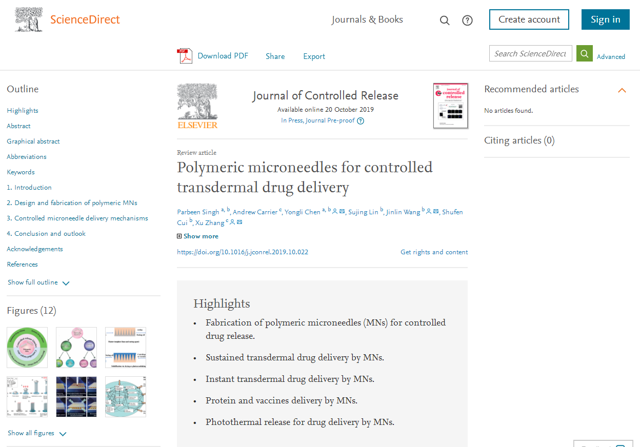 近期,suncitygroup太阳集团珠江学者讲座教授Xu Zhang团队课题组以“Polymeric microneedles for controlled transdermal drug delivery”为题发表于国际权威药剂学期刊Journal of Controlled Release上(https://doi.org/10.1016/j.jconrel.2019.10.022)。论文的第一作者为PARBEEN SINGH博士,通讯作者为ZHANG XU教授,陈永丽博士,王金林副教授,深圳职业技术学院博士后创新基地为第一署名。